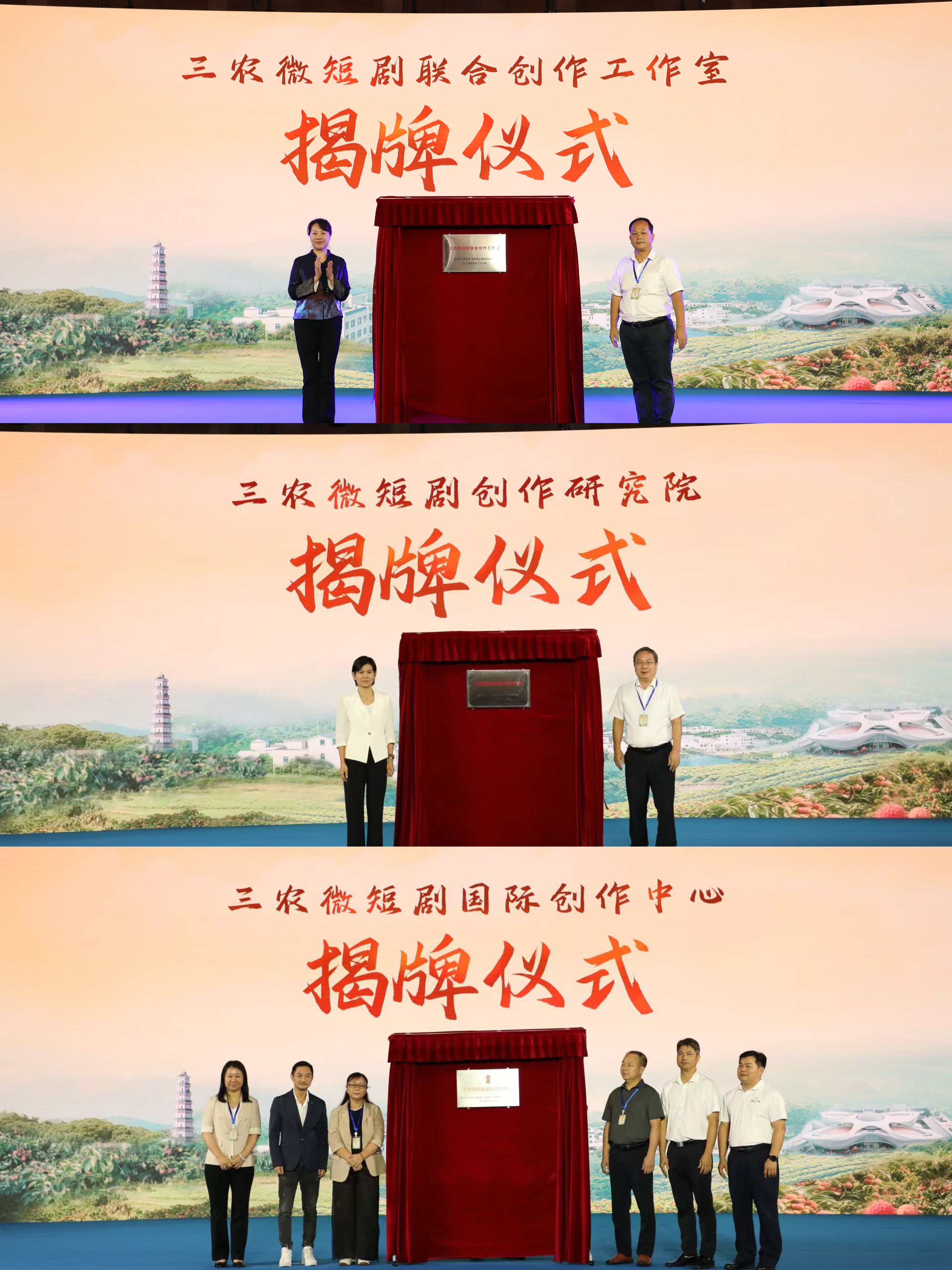 活动现场揭牌成立了高州市人民政府与中国农业电影电视中心共建的三农微短剧联合创作工作室、与华南农业大学珠江学院共建的三农微短剧创作研究院、与央视国际在线广东频道和广东省电影家协会导演委员会共建的三农微短剧国际创作中心。